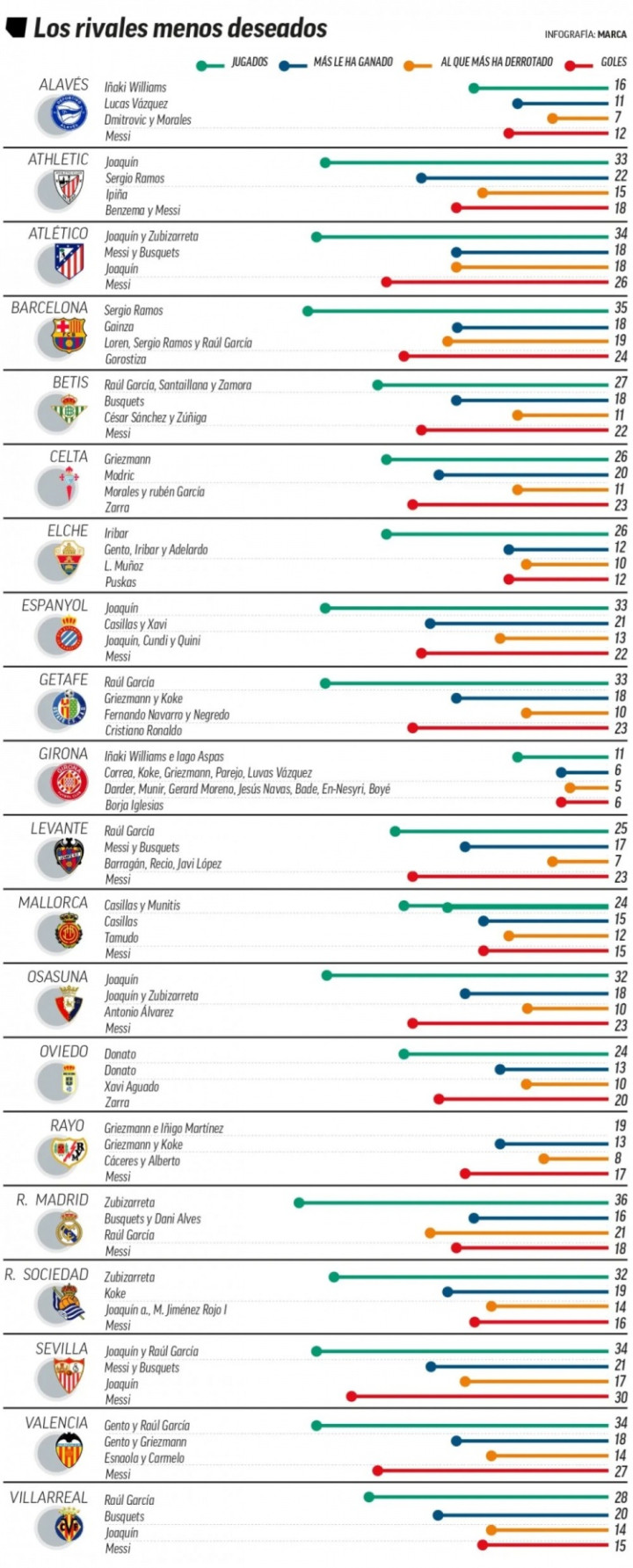 不同历史阶段的球队也有着不同的苦主。赫罗纳最大的敌手是打进6球的伊格莱西亚斯;而老牌球队奥维耶多和塞尔塔的头号克星则是据说弓手萨拉,他对奥维耶多打进了20球。此外,毕尔巴鄂竞技据说戈罗斯蒂萨曾24次攻破巴萨球门,普斯卡什则对埃尔切打进12球。本泽马则与梅西相通,是毕尔巴鄂竞技最头疼的敌手。