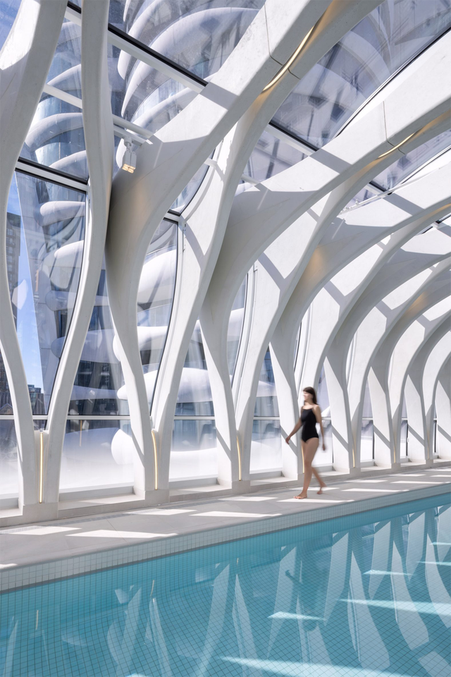 住宅塔楼的遐想很有巧想,楼板弃取分段式布局,让当然光和风能渗入到每一层。每隔3层还设有开畅的“太空花坛”,供住户逍遥不雅赏。更引东说念主安闲的是阿谁高出5楼的50米环形泳池,上方盖着由很多弧形支架撑起的玻璃顶篷。