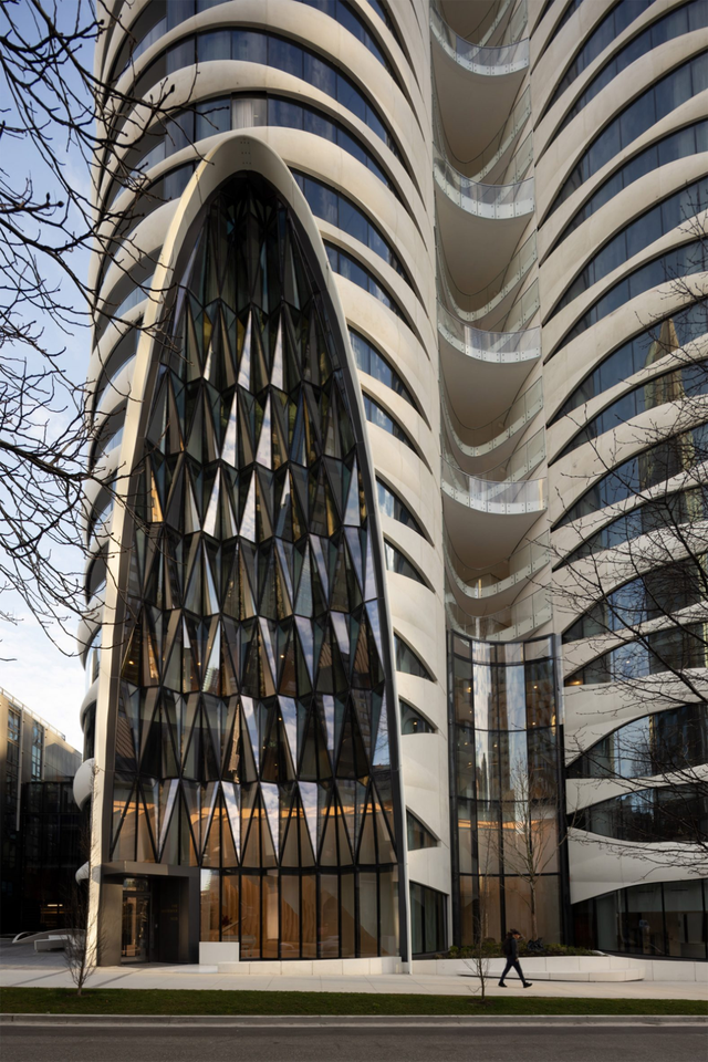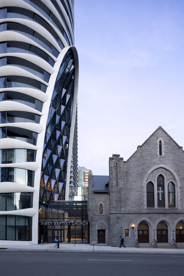 这座地标性塔楼由Revery Architecture遐想完成,总面积卓著60万平日英尺。格式包含一栋178.92米、共57层的住宅高楼、一栋中层出租楼,还包括对已有百年历史的第一浸信会教堂的开导与扩建。
