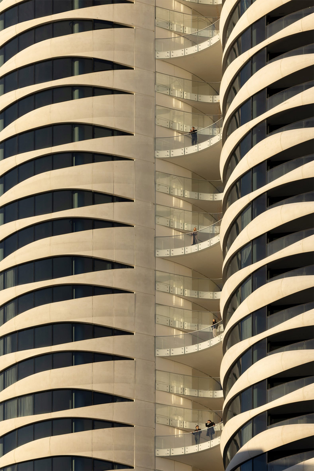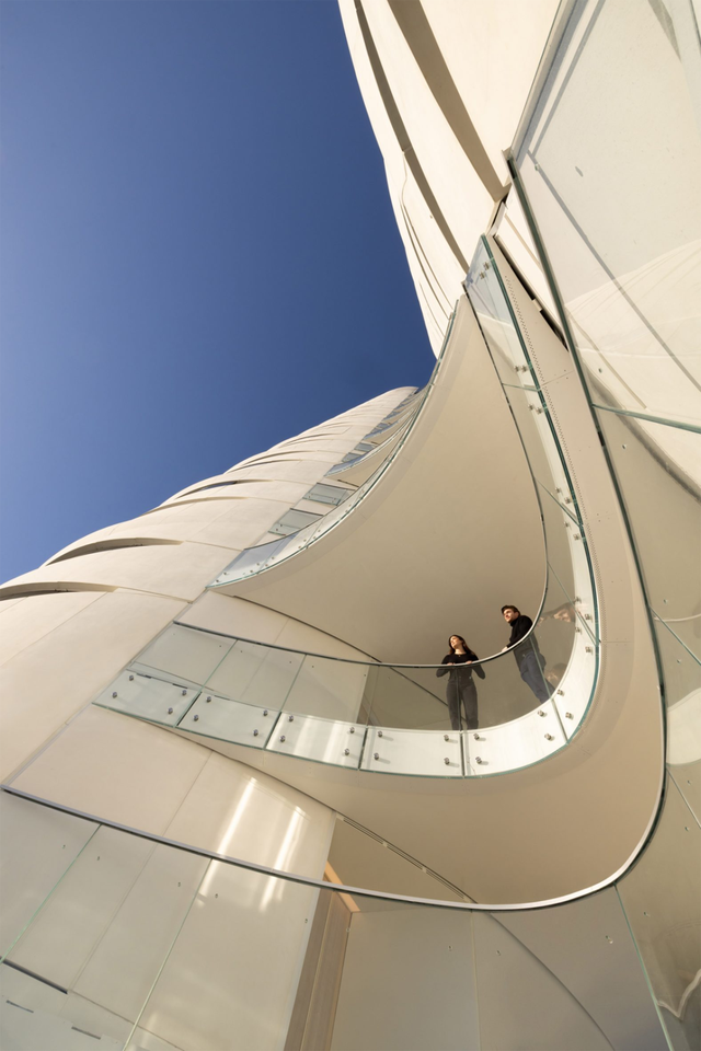建筑的外立面由弧形玻璃和预制混凝土板组合而成,从十几层驱动规章交错,酿成灵动的外不雅。