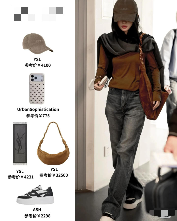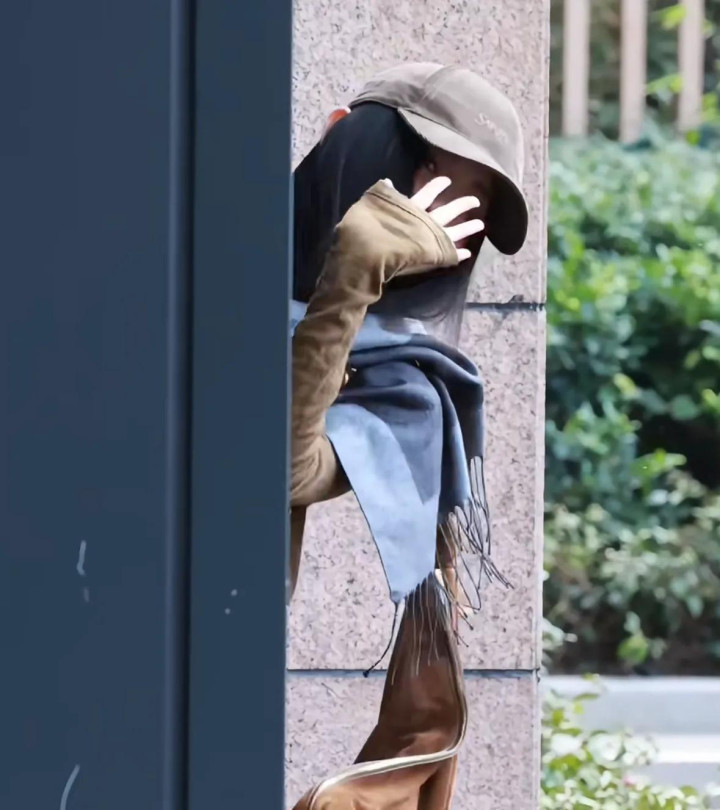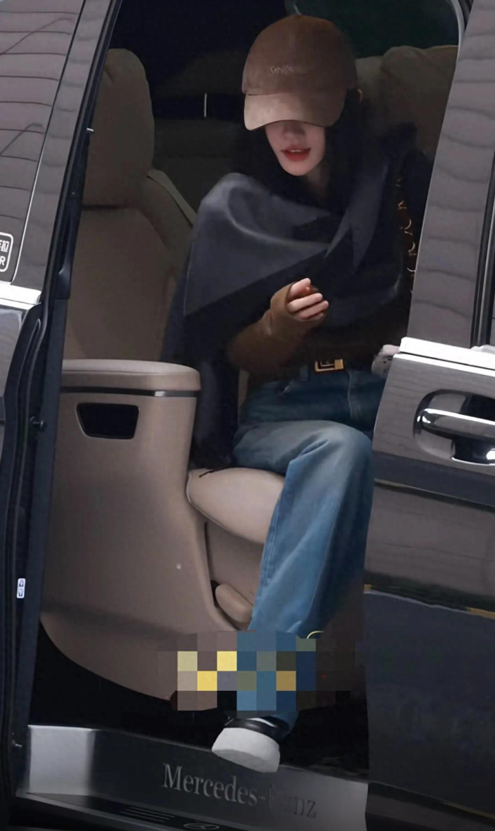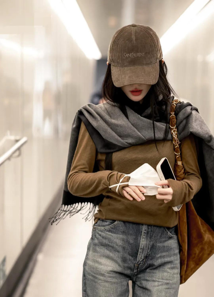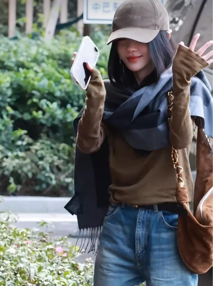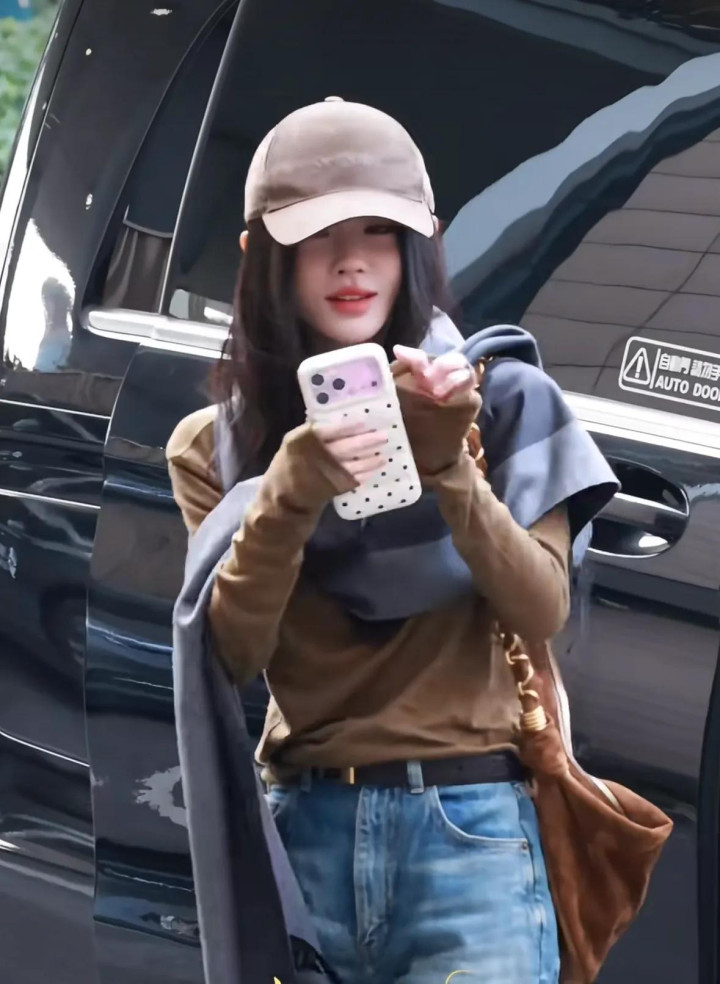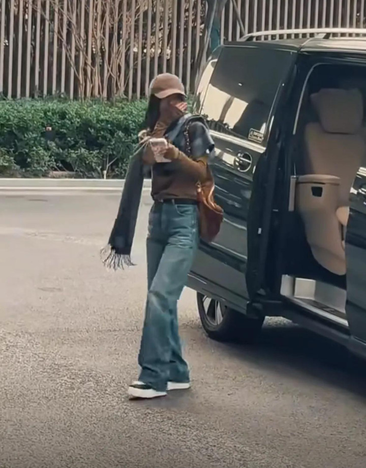 她从商务车凹凸来,戴着咖色的鸭舌帽,穿戴同色系上衣,搭配蓝色牛仔裤,还围了一条灰色的领巾,安闲感拉满。
